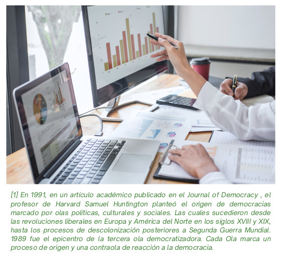 [1] En 1991, en un artículo académico publicado en el Journal of Democracy , el profesor de Harvard Samuel Huntington planteó el origen de democracias marcado por olas políticas, culturales y sociales. Las cuales sucedieron desde las revoluciones liberales en Europa y América del Norte en los siglos XVIII y XIX, hasta los procesos de descolonización posteriores a Segunda Guerra Mundial. 1989 fue el epicentro de la tercera ola democratizadora. Cada Ola marca un proceso de origen y una contraola de reacción a la democracia.